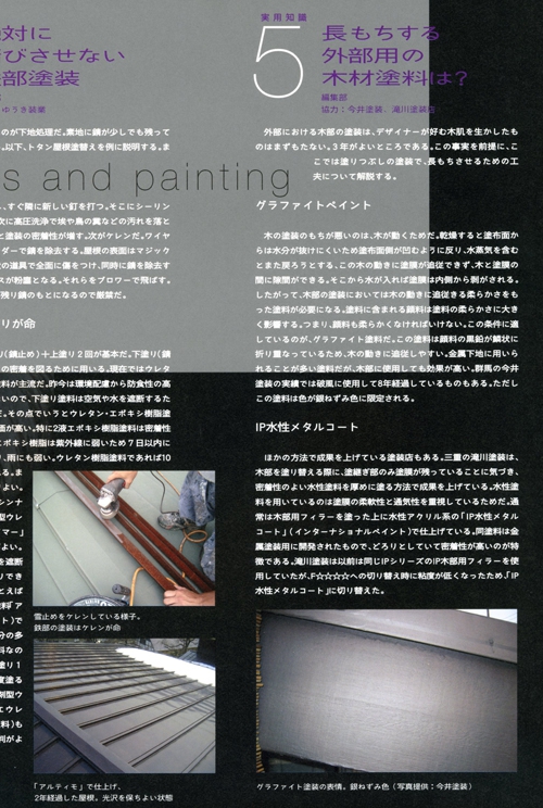 当店のオリジナル技法がムック本で紹介されました。(ちなみにムック本というのはMagazin【雑誌】とBook【書籍】の中間みたいな本と思ってもらうとわかりやすいかも)記事内容のお宅は施行例にもある津市のA様邸で、お施主様にも「要望を形にできた」とご満足いただけました。 どちらかというとプロ向け本で、一般の方々はなじみ薄いかもしれませんが(^_^;こういった形で技術をご紹介できるのは、なかなか嬉しいものです。写真も多く、美しい誌面ですので機会があれば一度ごらんください。